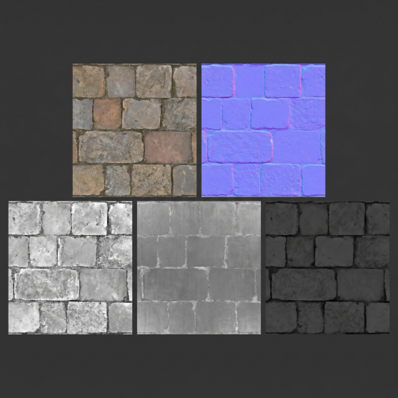 Alt text: Example PBR texture map set showing albedo, normal, roughness, metallic, and ambient occlusion